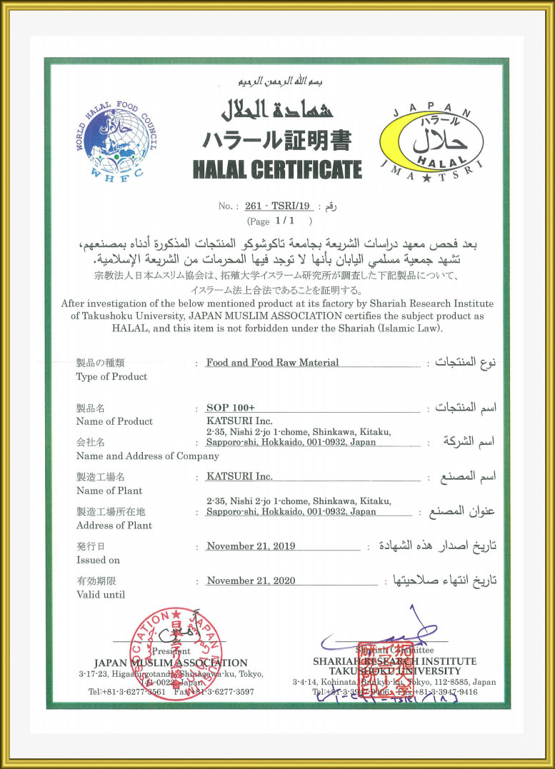 Selain itu, di tingkat Internasional, SOP 100+ juga telah mendapatkan Sertifikasi HALAL dari World Halal Food Council (WHFC) - Japan Muslim Association (JMA) dan beberapa sertifikasi lain: